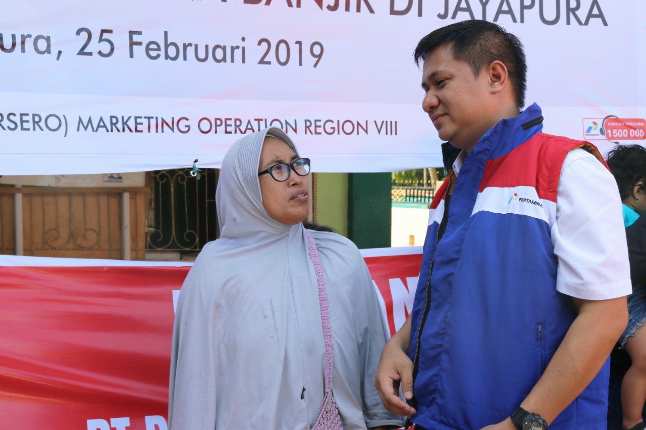 Penyaluran bantuan diserahkan langsung oleh Pjs. Unit Manager Comm, Rel & CSR, Bagja Mahendra ke 300 kepala keluarga terdampak banjir di kawasan permukiman belakang Pasar Youtefa, Jayapura, Papua, bertempat di Majsid Al Asri, Senin (25/2/2019).