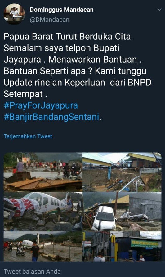 “Papua Barat turut berduka cita. Semalam saya telpon Bupati Jayapura, menawarkan bantuan. Bantuan seperti apa kami masih menunggu up date rincian keperluan dari BNPB setempat,” demikian ciutan Dominggus Mandacan yang dikuitp dari akun twitternya, Minggu (17/3/2019).
