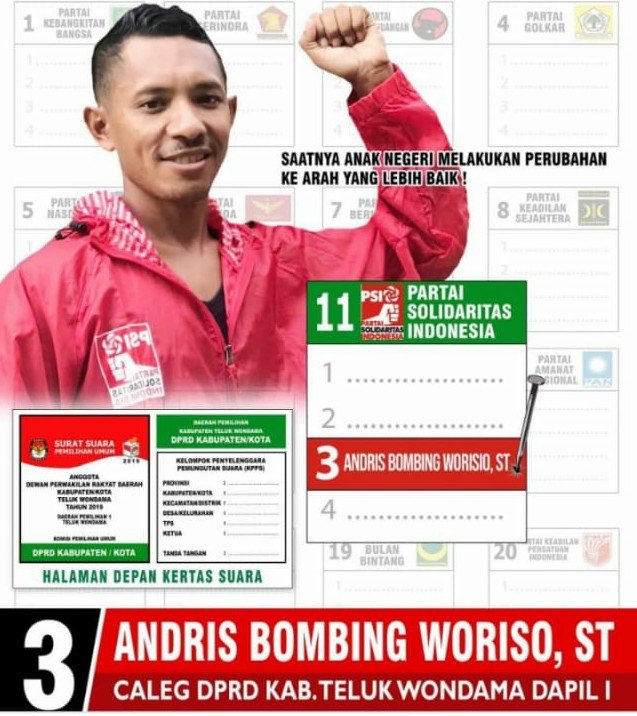Hal itu diungkapkan Andris Bombing Woriso, caleg DPRD Kabupaten Teluk Wondama, dari Partai Solidaritas Indonesia (PSI) nomor urut 3. Politikus muda ini punya komitmen memperjuangkan hal itu bersama PSI, partai yang menaunginya.