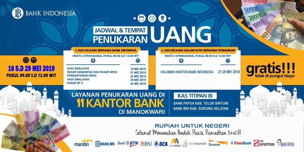 Selain menyediakan uang segar, BI perwakilan Papua Barat juga membuka layanan kas keliling di 3 kabupaten, yakni Teluk Wondama, Kaimana, dan Manokwari Selatan. BI juga membuka kas pelayanan penukaran uang sejak 16-29 Mei ke depan.
