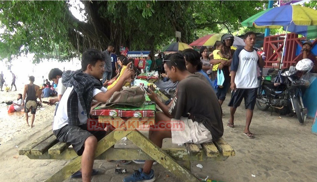Pantauan papuakita.com, pengunjung pantai pasir putih membludak. Jumlahnya mencapai ribuan orang, yang tengah menikmati awal tahun di tempat wisata pantai pasir putih. Kondisi ini tentu saja sangat menguntungkan para penjual barang dan pedagang makanan yang banyak di jumpai di pantai ini.