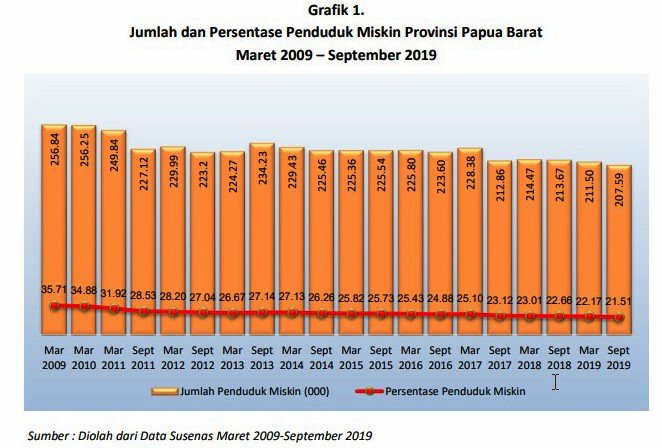 Adapun keseluruhan di Papua Barat periode Maret 2019 hingga September 2019, terjadi penurunan tingkat kemiskinan sebesar 0,66 persen poin yakni dari 22,17 persen menjadi 21,51 persen. Dengan kata lain, terjadi penurunan jumlah penduduk miskin di Papua Barat sebanyak 3,91 ribu orang pada periode tersebut.