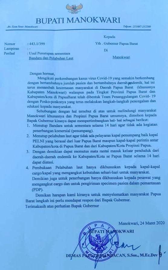 Menyangkut dengan surat Bupati Manokwari Nomor: 443.1/399 yang ditujukan kepada Gubernur Papua Barat terkait usulan penutupan bandara dan pelabuhan untuk sementara waktu. Dibenarkan oleh Demas Mandacan.