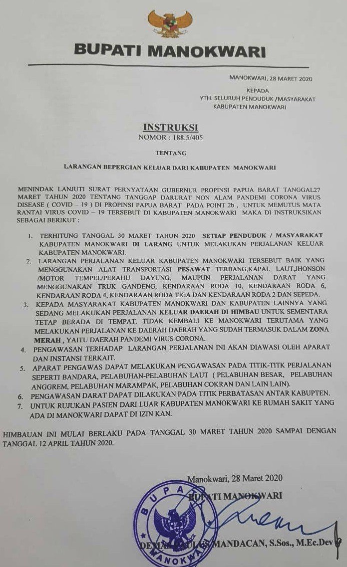Larangan ini berlaku selama 14 hari ke depan dan efektif berlaku per 30 Maret hingga 12 April mendatang, sebagaimana terutang dalam Instruksi Bupati Manokwari Nomor 188.5/405 Tentang Larangan Berpergian Keluar Dari Kabupaten Manokwari tertanggal 28 Maret 2020.