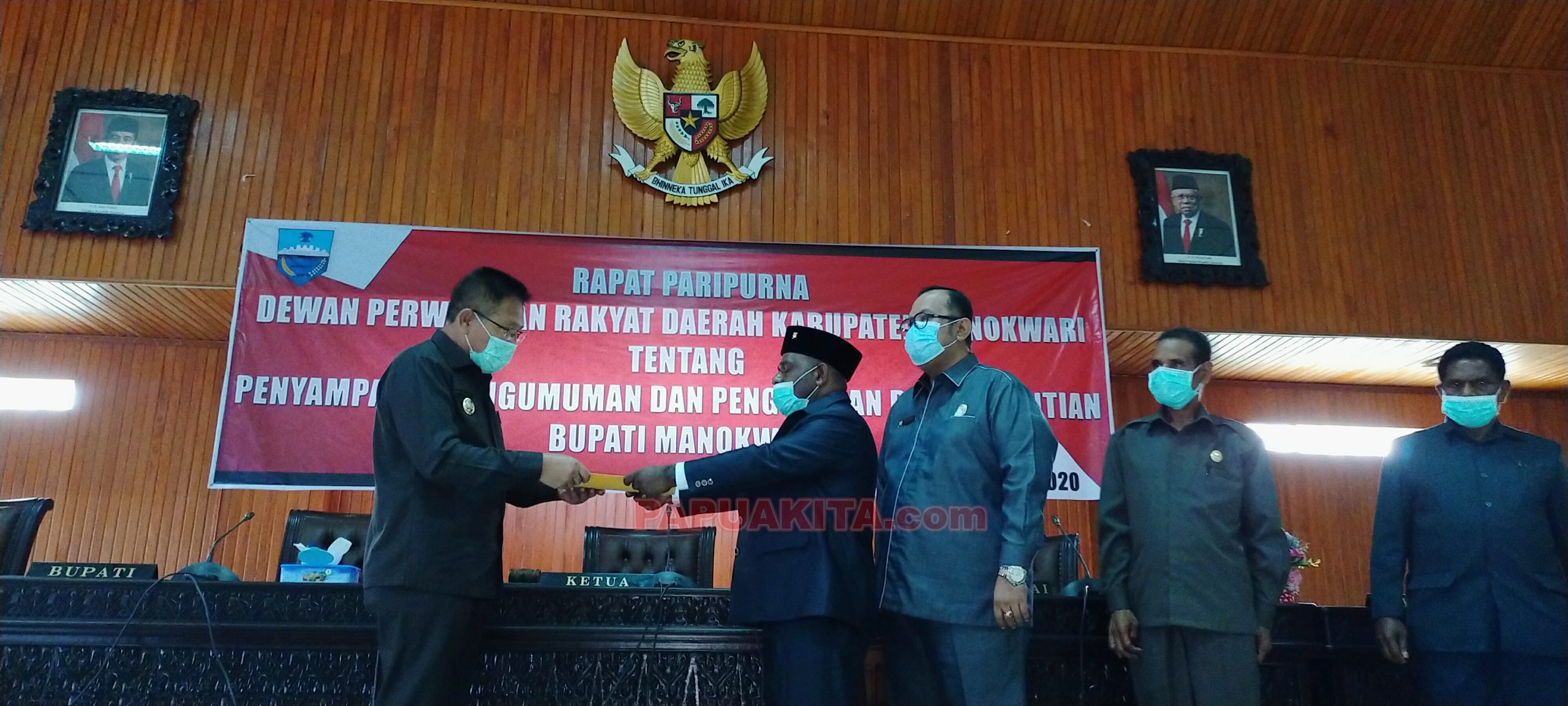 MANOKWARI, PAPUAKITA.com—Rapat Paripurna DPRD Kabupaten Manokwari tentang penyampaian dan pengusulan pemberhentian dengan hormat Demas Paulus Mandacan sebagai Bupati Manokwari (2016-2021) resmi digelar, Kamis (14/5/2020).