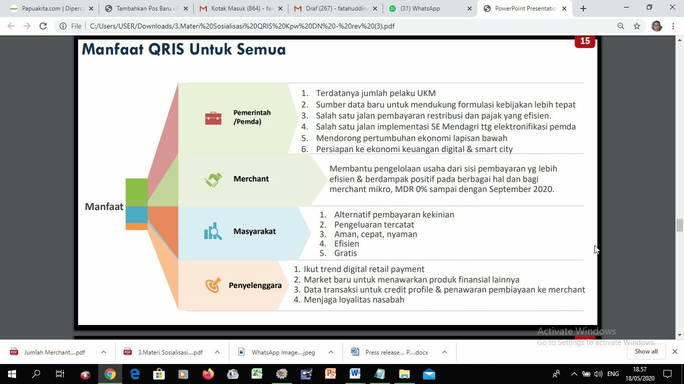 “QRIS menjadi salah satu solusi pembayaran di tengah pandemi covid19. Sistem pembayaran ini bisa membantu menekan penyebaran penyakit Covid-19,” kata Kepala Perwakilan Bank Indonensia Provinsi Papua Barat, S. Donny Heatubun di sela sosialisasi pembayaran nontunai berbasis QRIS, Senin (18/5/2020).