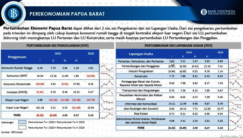 “Pertumbuhan ekonomi tahun 2020 diproyeksikan tumbuh pada kisaran 4,0%-5,0% (yoy) dengan asumsi dampak Covid-19 yang moderat. Berdasarkan realisasi pertumbuhan ekonomi Papua Barat pada triwulan I 2020, perekonomian cukup terbantu dengan masih solidnya konsumsi rumah tangga dengan pertumbuhan sebesar 4,81% (yoy) di tengah membaiknya ekspor yang masih tercatat kontraksi sebesar -14,70% (yoy),” papar Donny Heatubun.