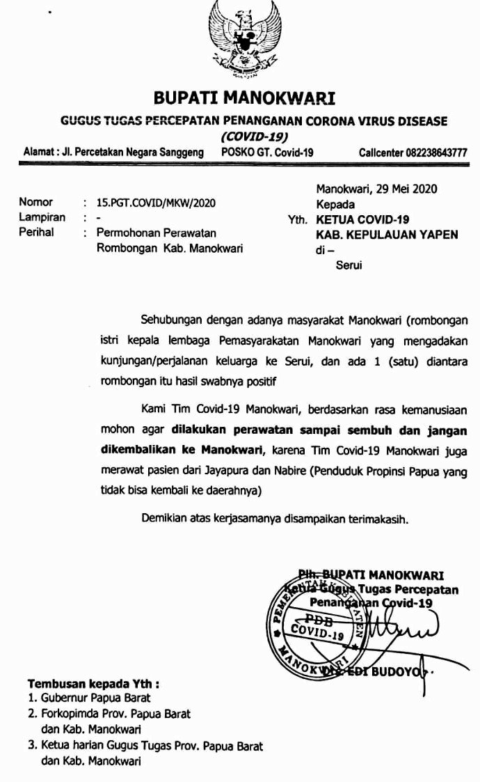 Diketahui, Pemkab Manokwari telah mengeluarkan surat permohonan ihwal permohonan perawatan rombongan kabupaten Manokwari. Surat ini ditujukan kepada Ketua Covid-19 Kabupaten Kepulauan Yapen. Surat ini dilayangkan pada 29 Mei 2020 dan ditandatangani oleh Plt. Bupati Manokwari, Edi Budoyo.