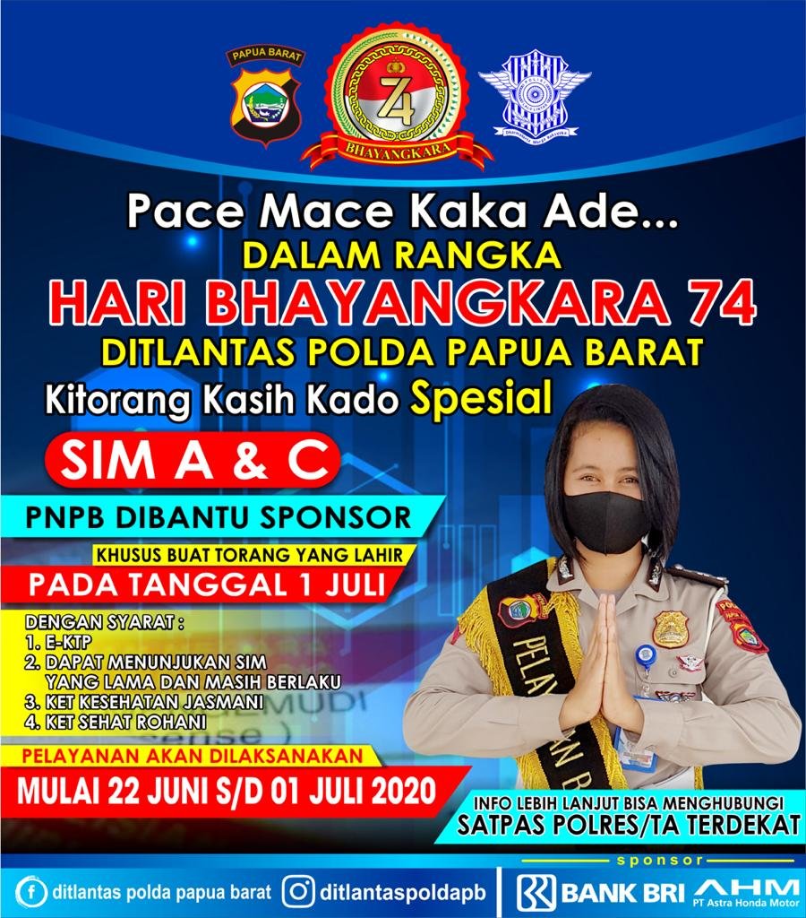 “Pembuatan SIM spesial berlangsung serentak di seluruh Indonesia termasuk di Provinsi Papua Barat, ini berlaku per 1 Juli 2020 bersamaan dengan hari Bhayangkara ke 74,” kata Dirlantas Polda Papua Barat, AKBP Raydian Kokrosono, S. IK melalui keterangan tertulis, Selasa (16/6/2020).