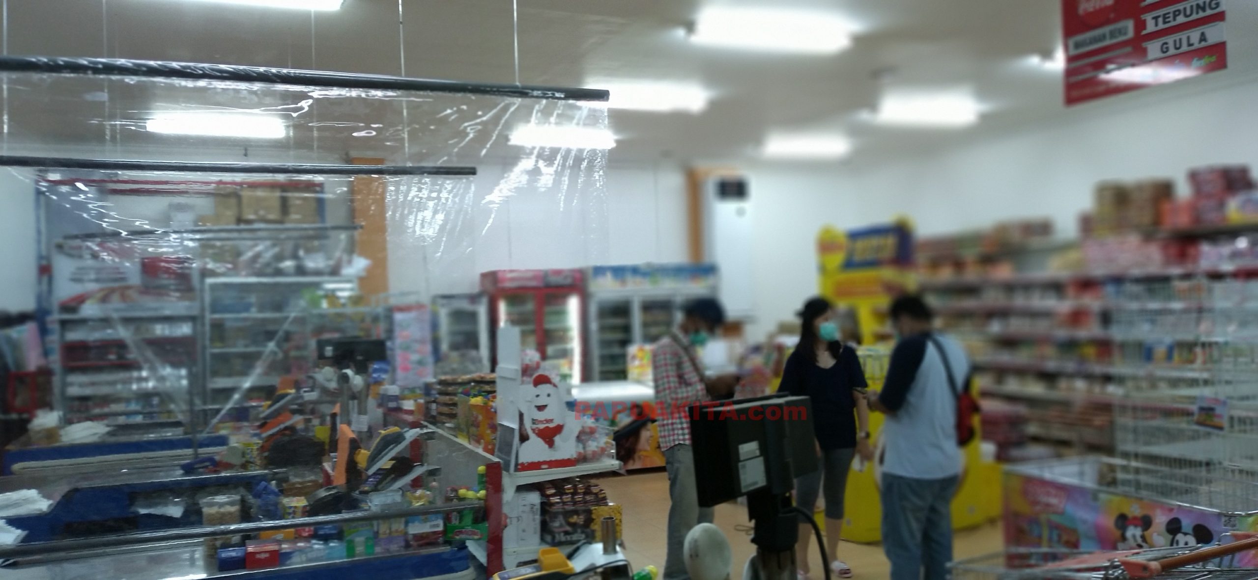 Sekat pembatas yang terbuat dari plastik transparan terpasang di meja kasir Swalayan Orchid Manokwari. Foto : ARF