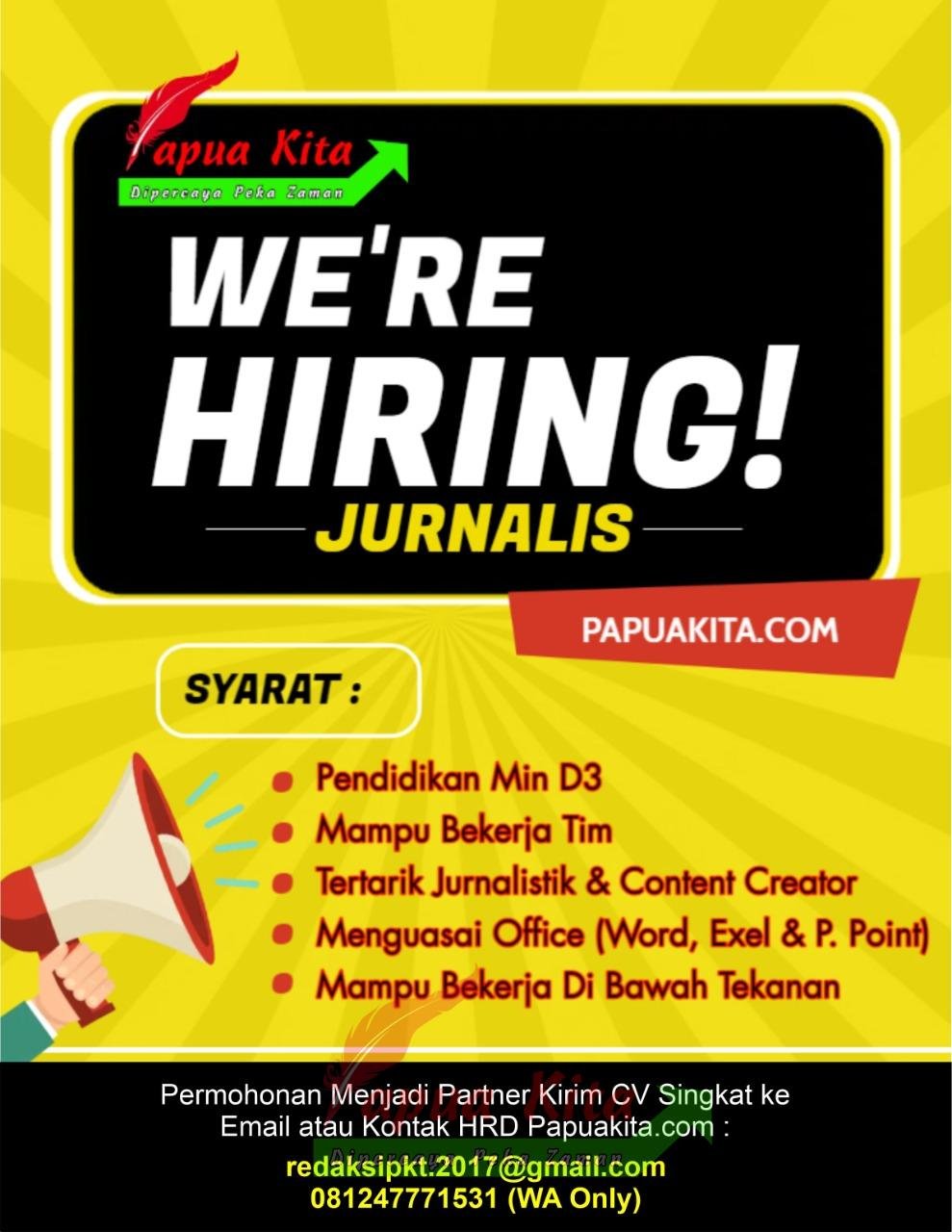 Berkarya bersama Redaksi PAPUAKITA.com membuka kesempatan bagi pemuda pemudi untuk berkarya menjadi Jurnalis di Wilayah Manokwari.