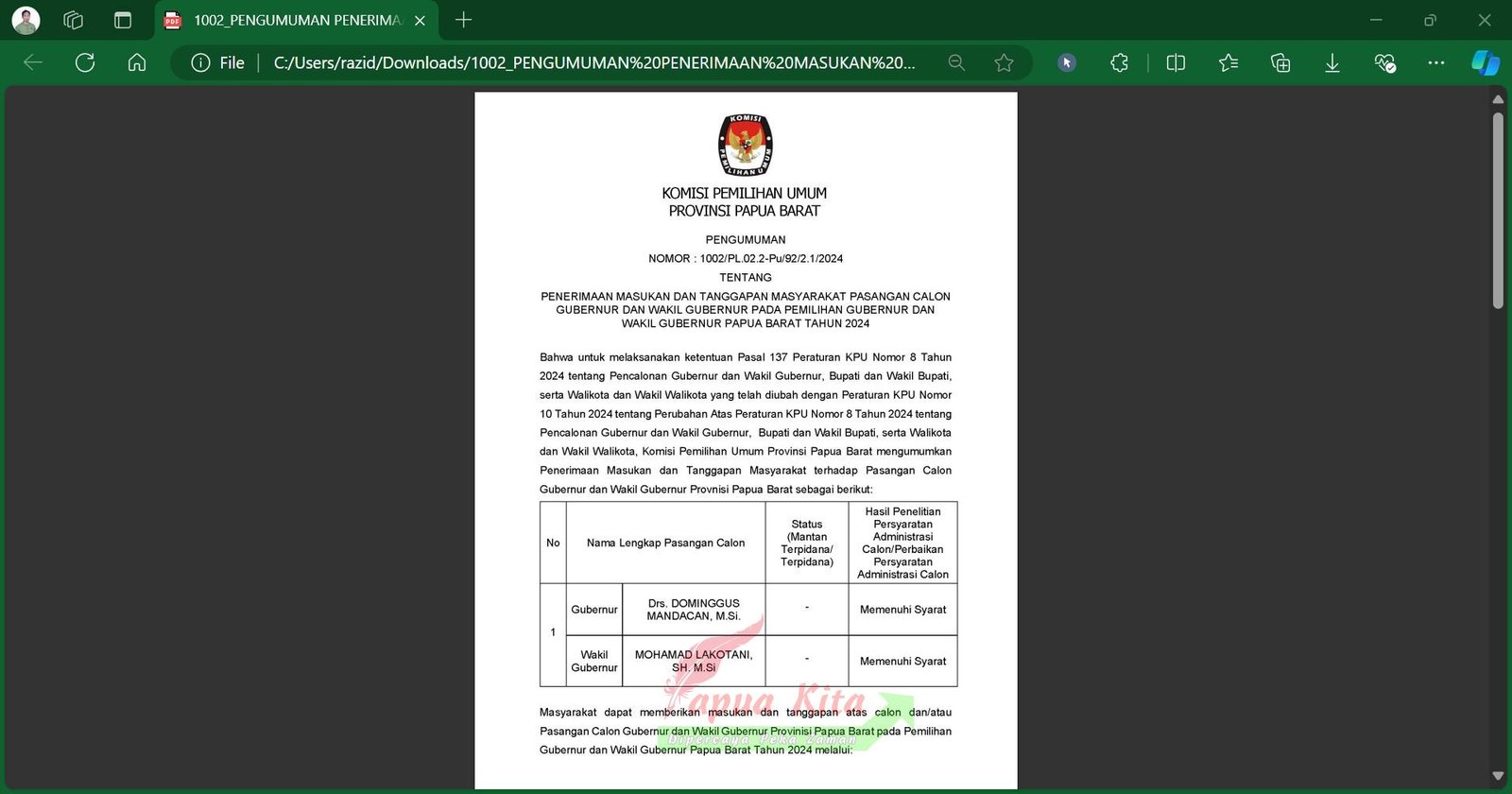 Bahwa untuk melaksanakan ketentuan Pasal 137 Peraturan KPU Nomor 8 Tahun 2024 tentang Pencalonan Gubernur dan Wakil Gubernur, Bupati dan Wakil Bupati, serta Walikota dan Wakil Walikota yang telah diubah dengan Peraturan KPU Nomor 10 Tahun 2024 tentang Perubahan Atas Peraturan KPU Nomor 8 Tahun 2024 tentang Pencalonan Gubernur dan Wakil Gubernur, Bupati dan Wakil Bupati, serta Walikota dan Wakil Walikota, Komisi Pemilihan Umum Provinsi Papua Barat mengumumkan Penerimaan Masukan dan Tanggapan Masyarakat terhadap Pasangan Calon Gubernur dan Wakil Gubernur Provnisi Papua Barat