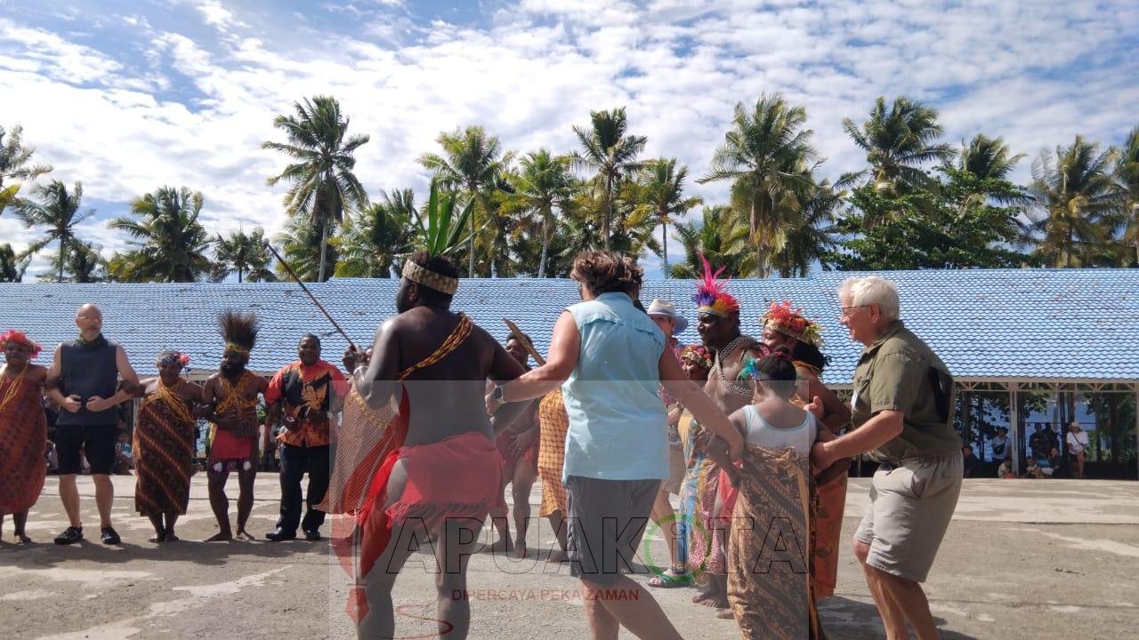 Wisatawan mancara negara saat berinteraksi dengan masyarakat yang menyambut mereka di Pulau Mansinam